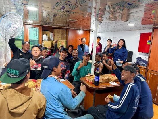 | 另外,船東特別準備了餐點,邀請船員與夥伴們一起用餐同樂。在忙碌與緊繃之中,這短暫的相聚成了一段難得的放鬆時光。簡單的一餐,卻盛著關心與祝福,也拉近了彼此的距離。