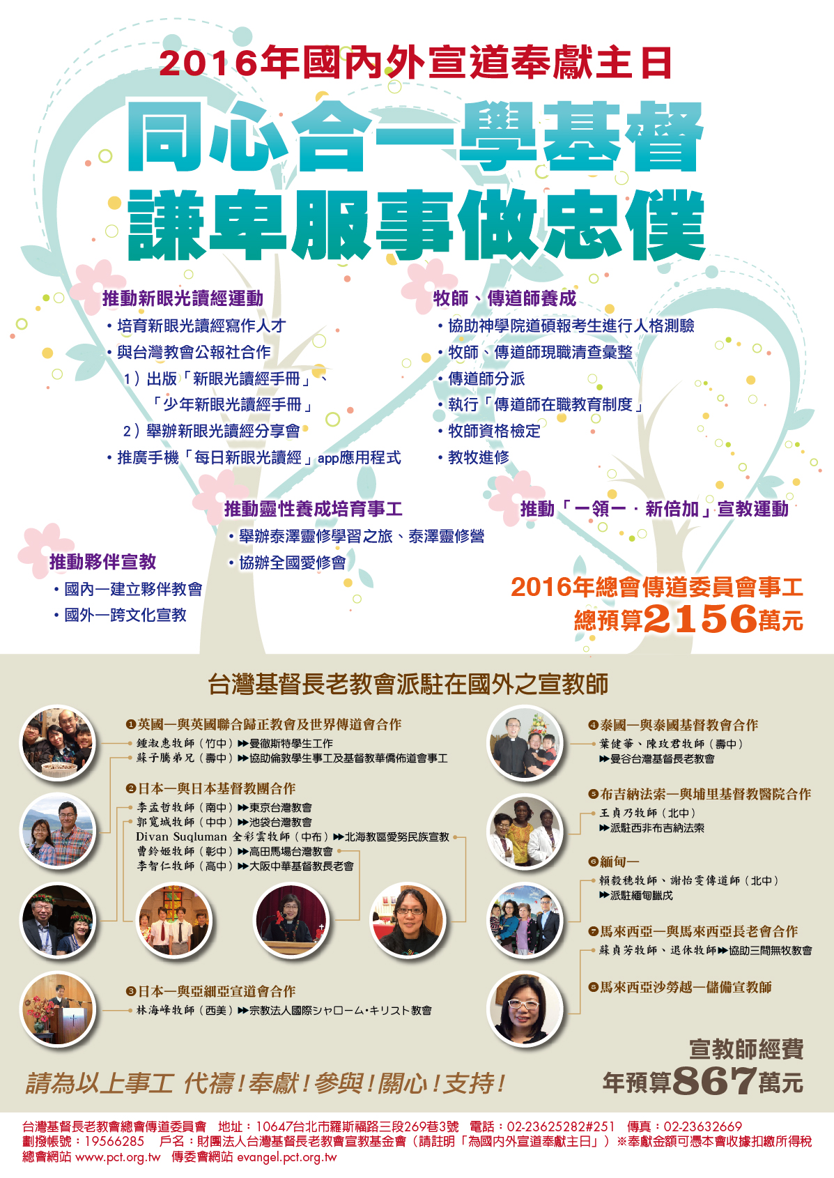 感謝您對台灣基督長老教會在2015年所有宣道事工的關心、請持續為2016年總會所要推動的宣教事工代禱、參與和奉獻。